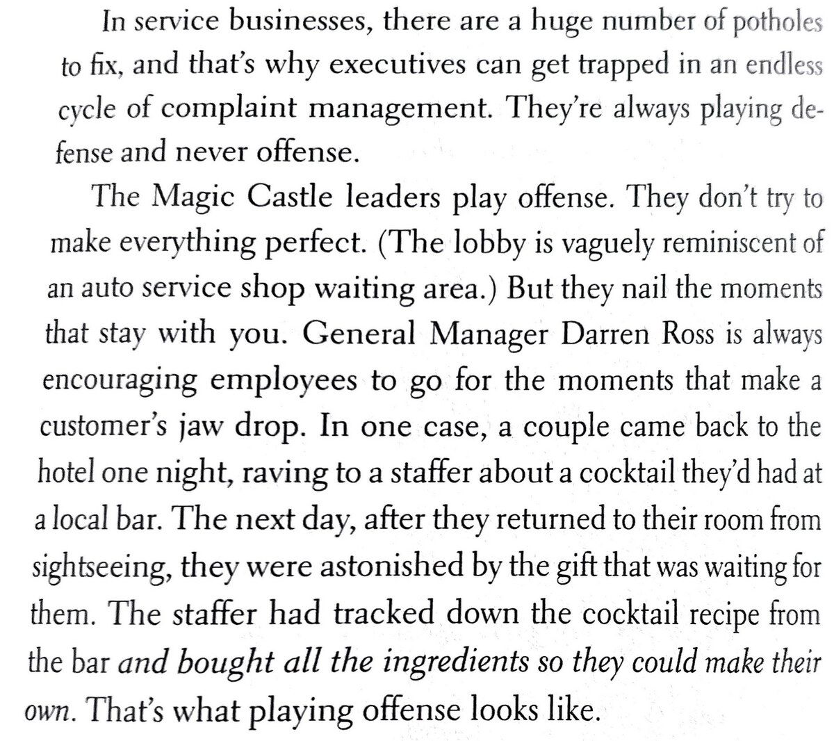 The authors continue with the example of the Magic Castle Hotel in LA - a hotel gets glowing reviews online because of how they “play offense” to delight their guests.