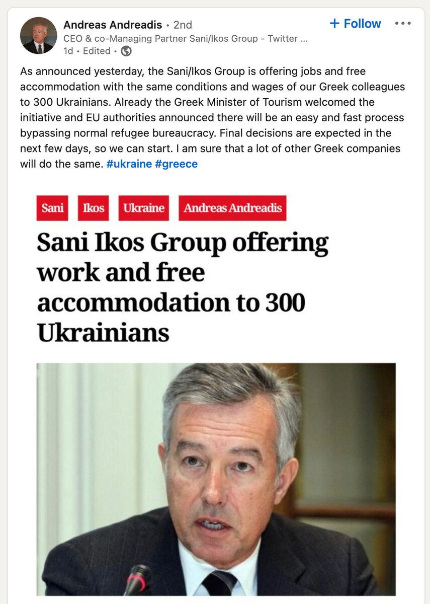 Sani/Ikos Group is offering jobs and free accommodation with the same conditions and wages as their Greek staff to 300 Ukrainians: