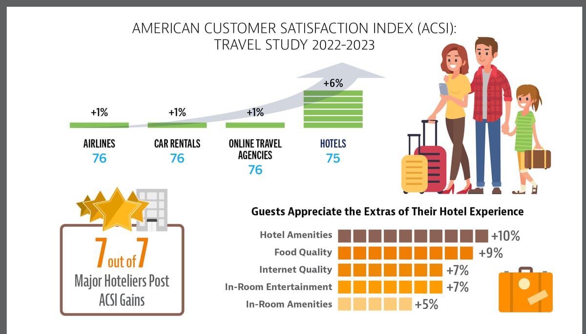 What’s going on: Wanderlust is not the only thing that people are giving in to again; they are also relishing all the amenities that come with it. The American Customer Satisfaction Index (ACSI®) Travel Study 2022-2023 reveals that satisfaction levels have risen across all four sectors measured - airlines, hotels, car rentals, and online travel agencies. Hotels are leading the pack.