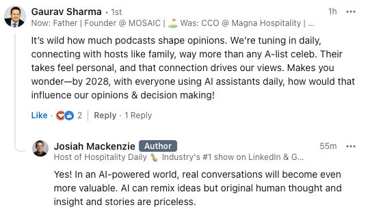 Conversations are the cornerstone of what we do here at Hospitality Daily because they work. There’s no better way to change hearts and minds in media than hearing someone talk about something in depth, sharing stories and what they’ve learned. And I think this will only increase with time, as I shared on LinkedIn this morning: