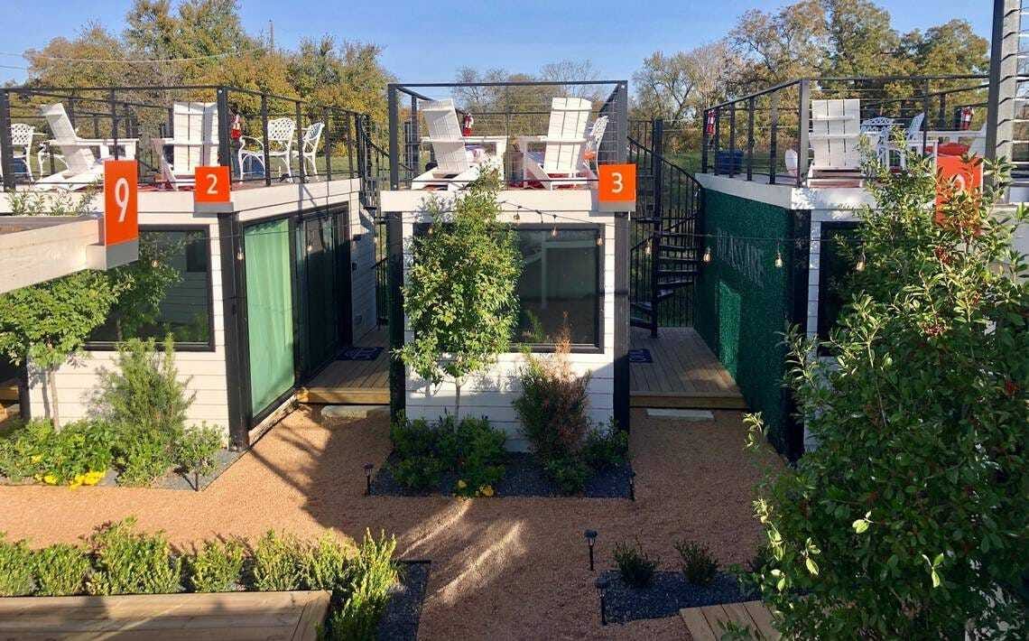 Guests can take room service meals on private rooftop decks adorned with Adirondack chairs, Yeti coolers and Solo stoves (for a smokeless bonfire). The property offers bocce courts and a pool fashioned from an old shipping container that can be heated or cooled to fit the weather.